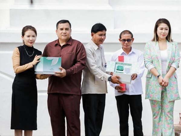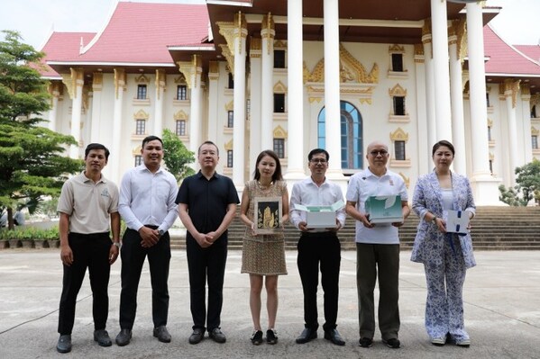 百雀羚集团国际事业部兰俐女士、首席品牌官邵茜女士与琅勃拉邦王宫博物馆及老挝旅游局互赠礼物