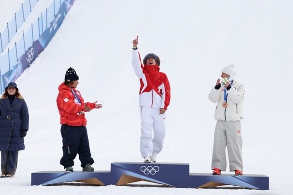 2026冬季男子单板滑雪坡面障碍技巧领奖台 从左至右:BURTON团队运动员Taiga Hasegawa、苏翊鸣、Jake Canter
